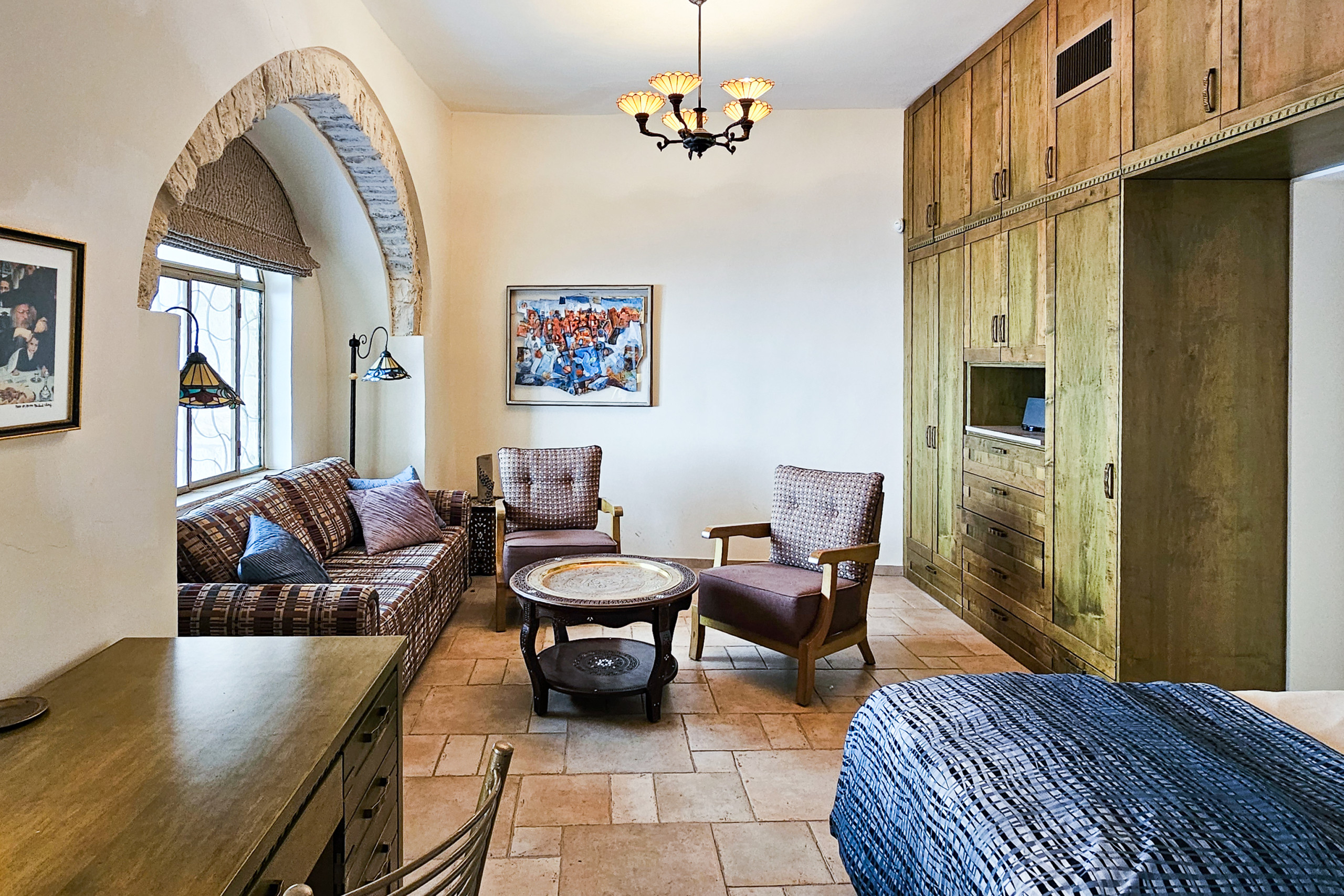 The main living space is divided between the seating area and the bedroom, all framed by original stone details, built-in niches, and warm lighting.