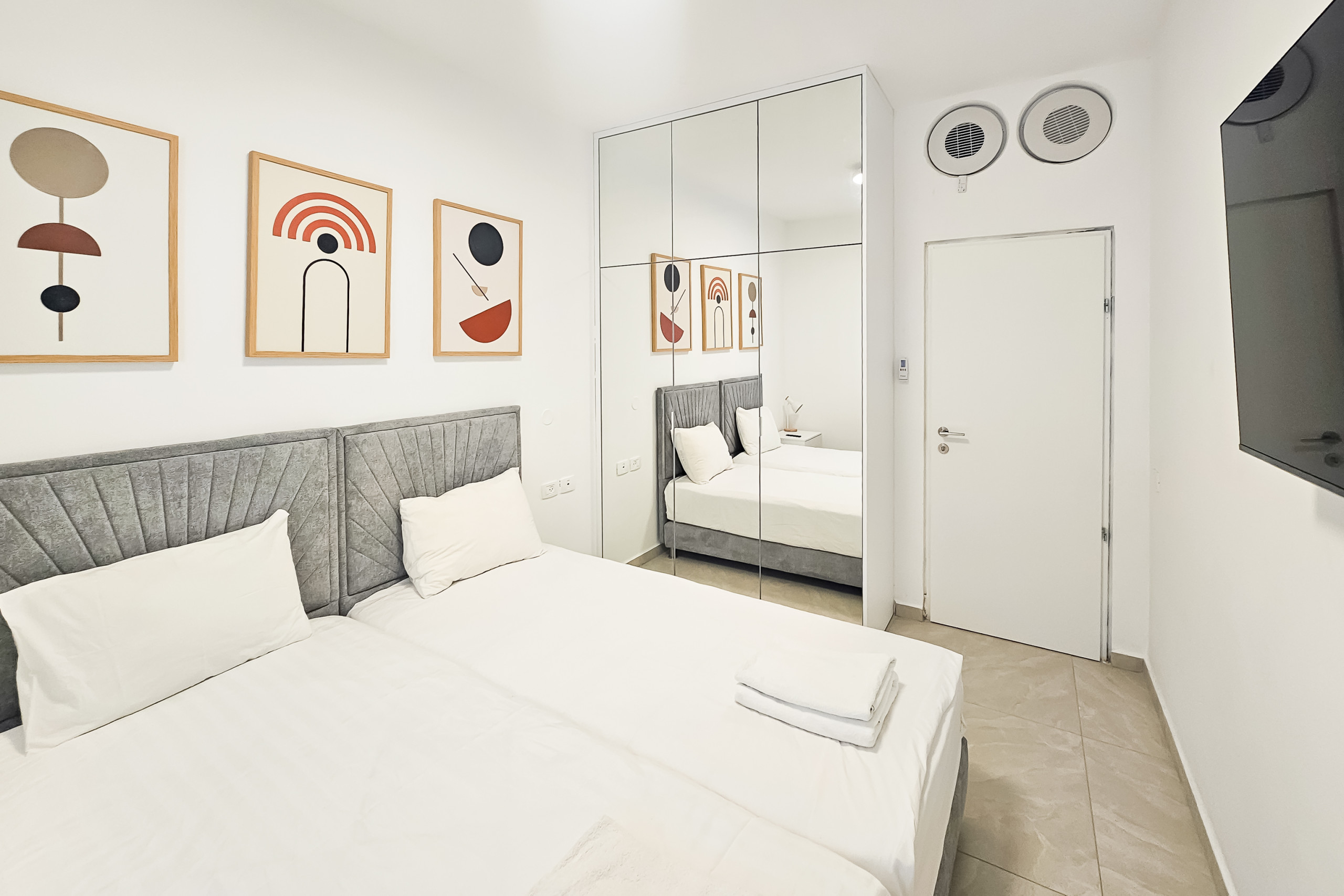 Bedroom 2: two single beds that can be configured into a queen-size bed, full-height closet, smart TV. This bedroom is also the MAMAD (safe room) in case of emergency.