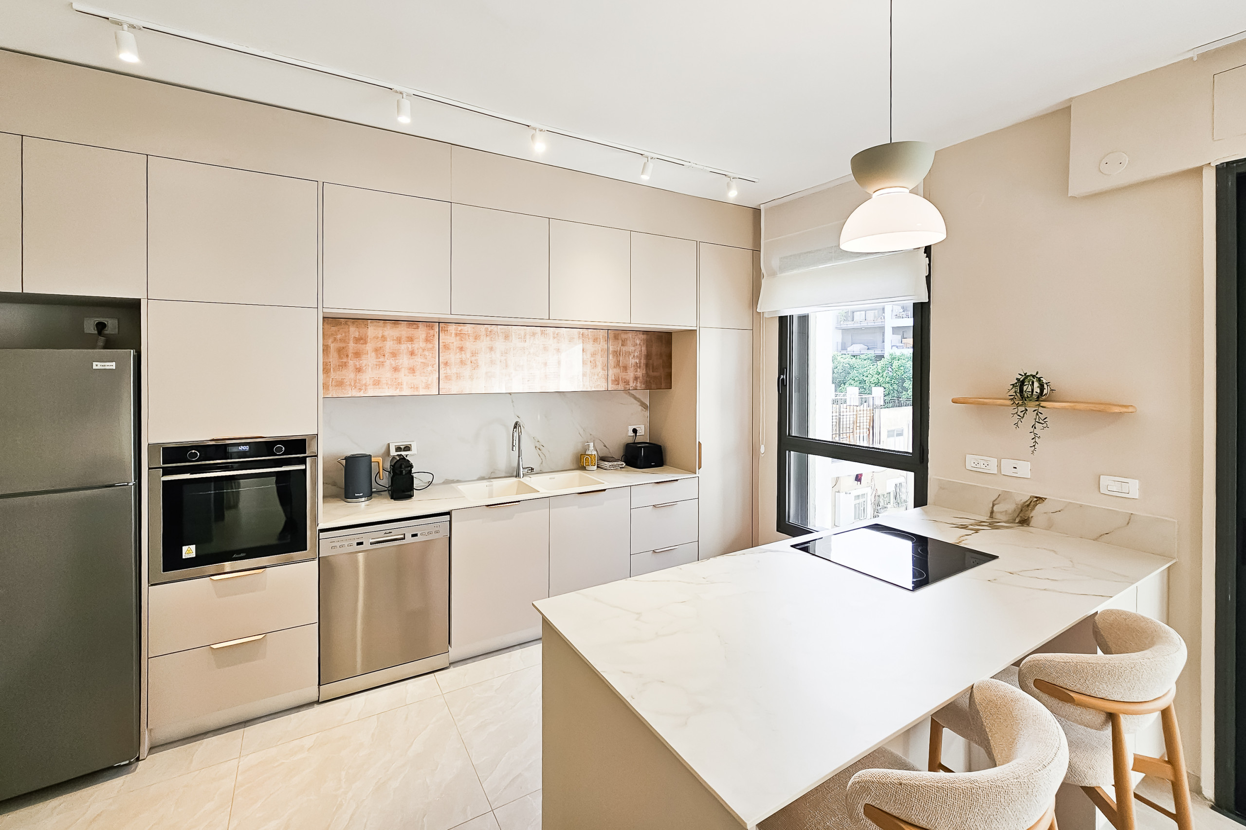 The fully equipped kitchen includes an induction cooktop, oven, dishwasher, coffee machine, kettle, toaster, Shabbat hot plate, refrigerator, and freezer.
