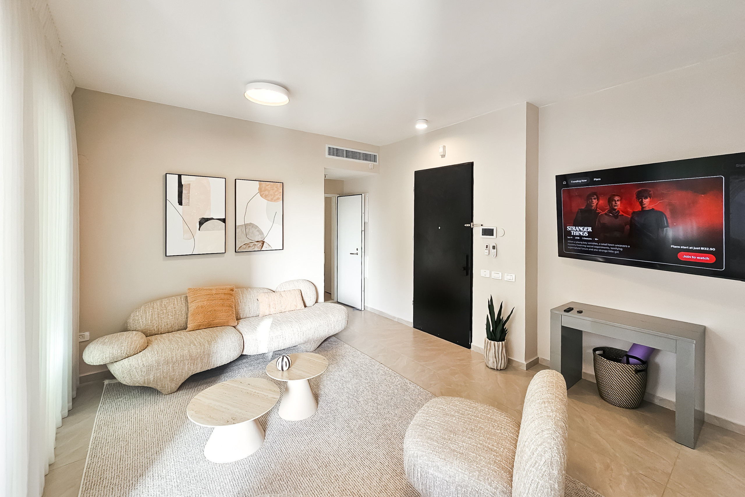The living room features stylish, high-end sofas and a smart TV. Step out onto the balcony, where you’ll find a seating area with a coffee table and two chairs — the perfect spot to enjoy your morning coffee.