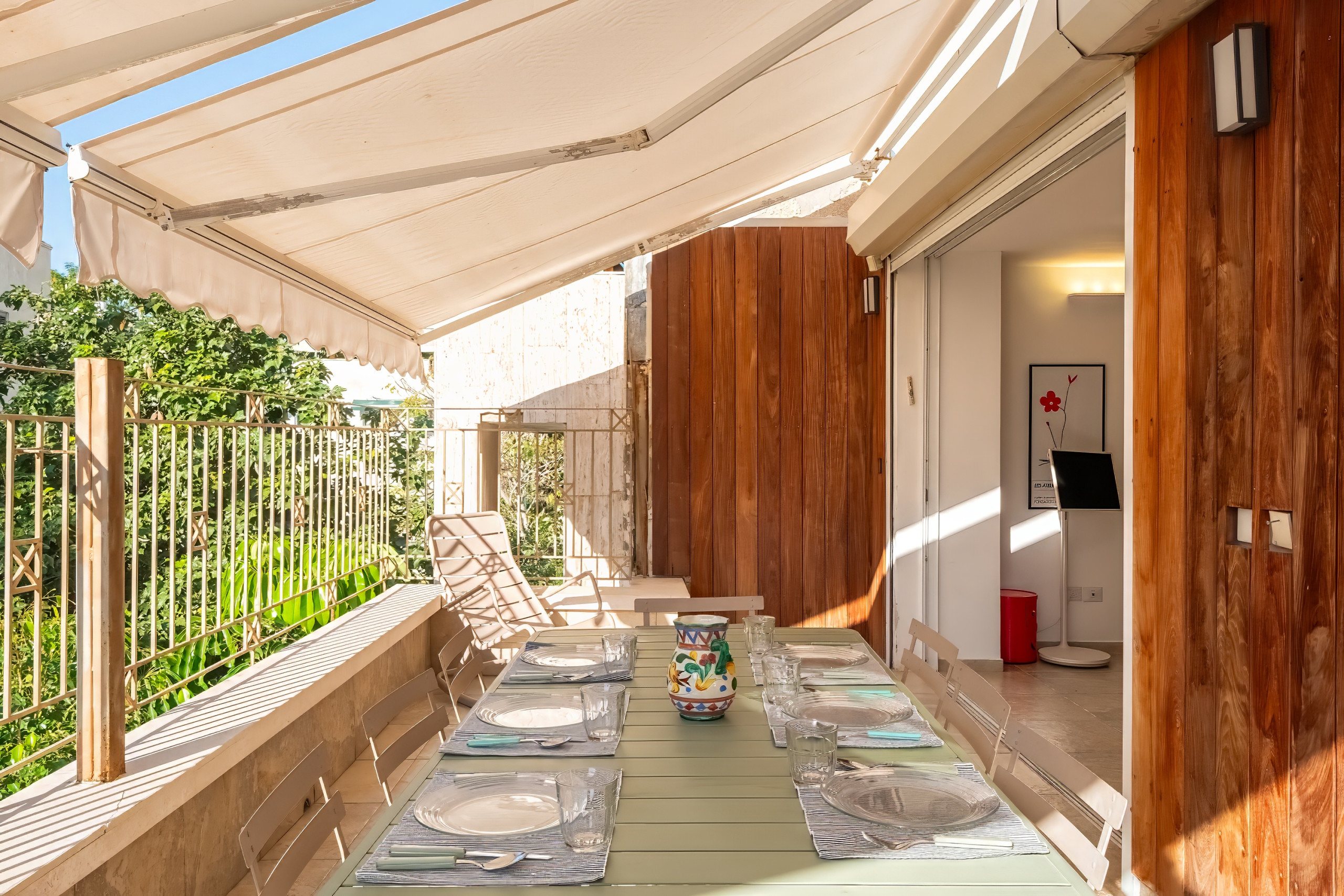 Access to the sunny terrace with retractable sunshades, furnished with a dining table and a sun lounger.
