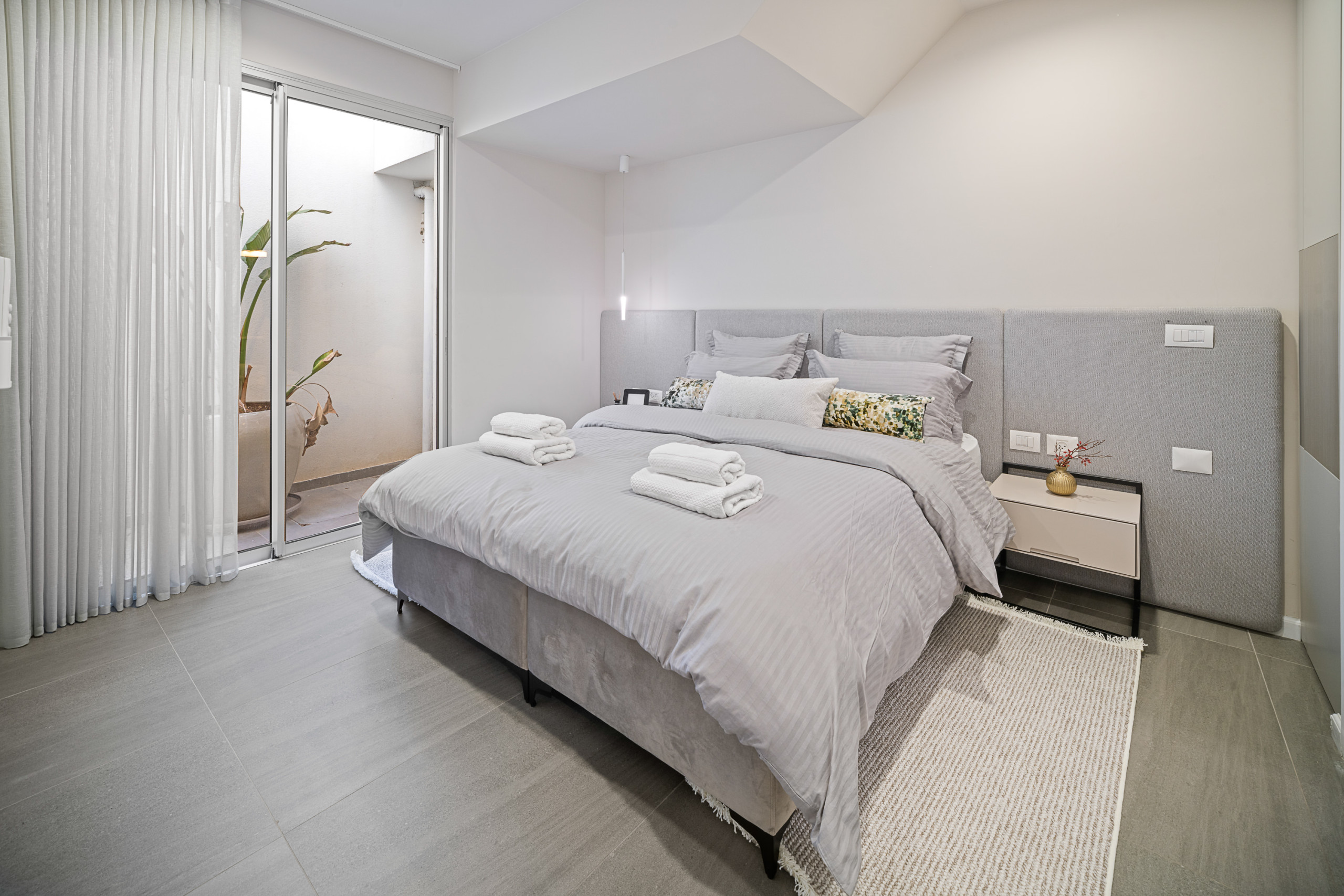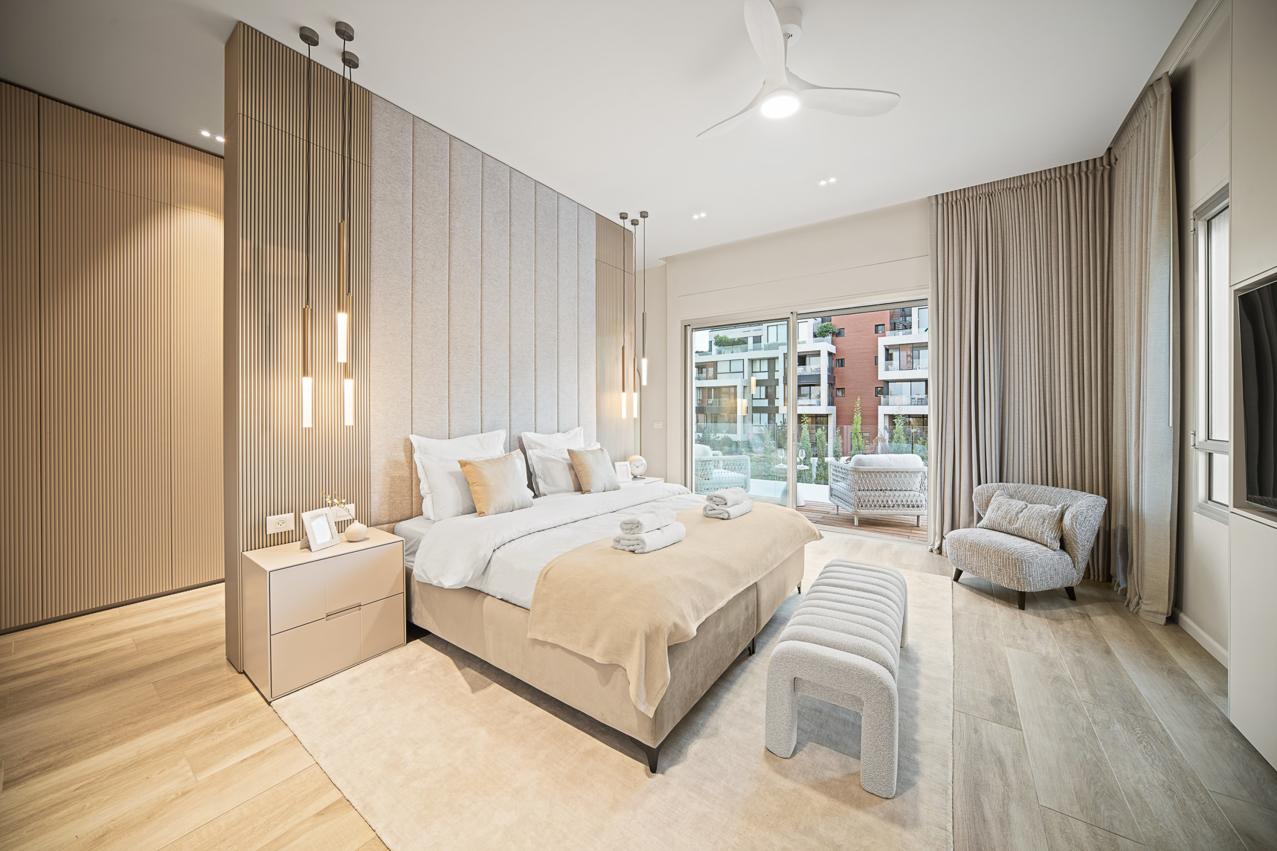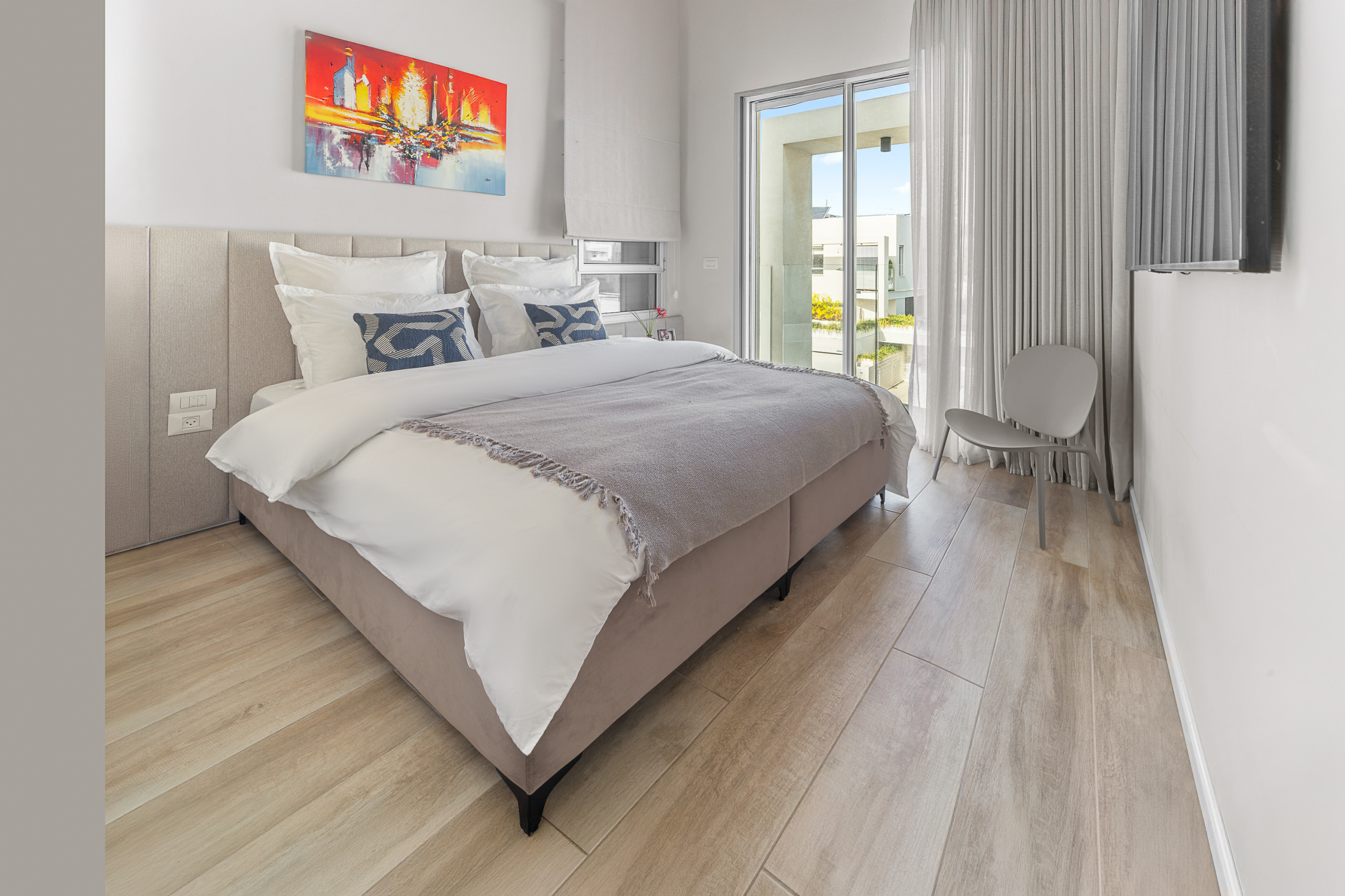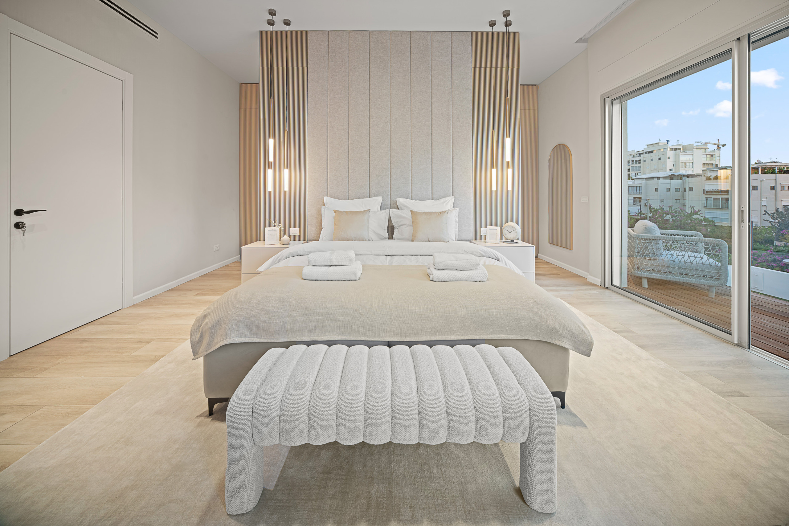 Главная спальня (спальня 1) с кошерной кроватью (может быть сделана как кровать king size или две отдельные кровати 90 см), Smart TV, встроенный шкаф в полный рост и собственная полная ванная комната с душем walk-in. Доступ к частной меблированной террасе площадью 12 м².