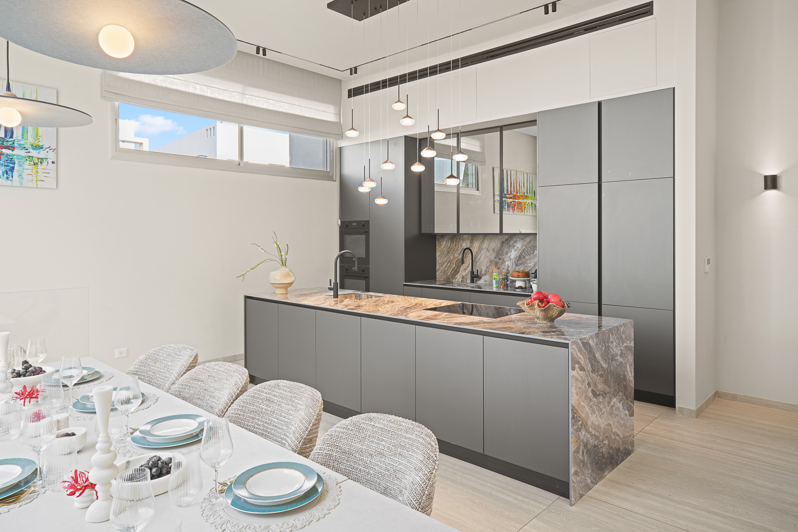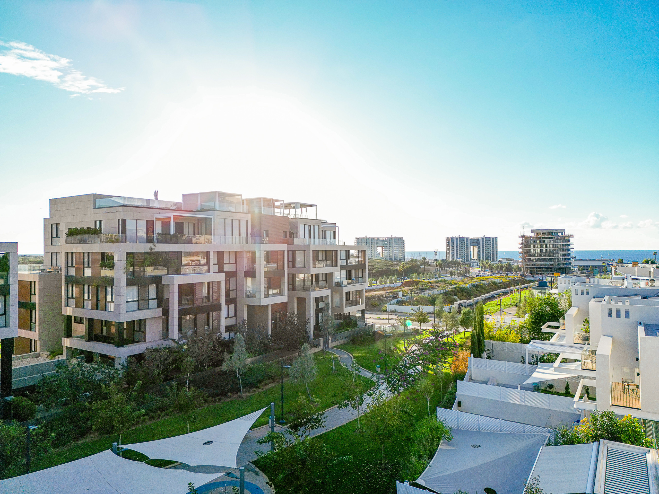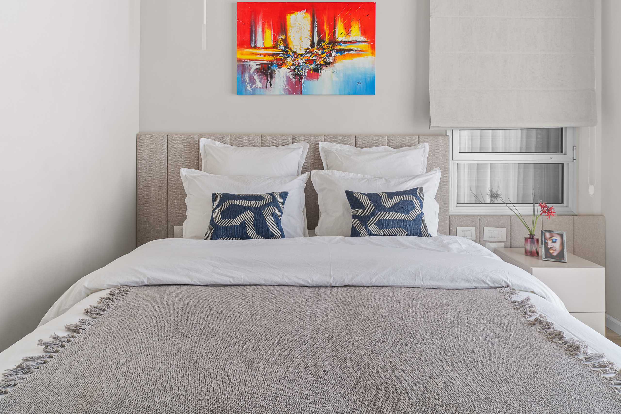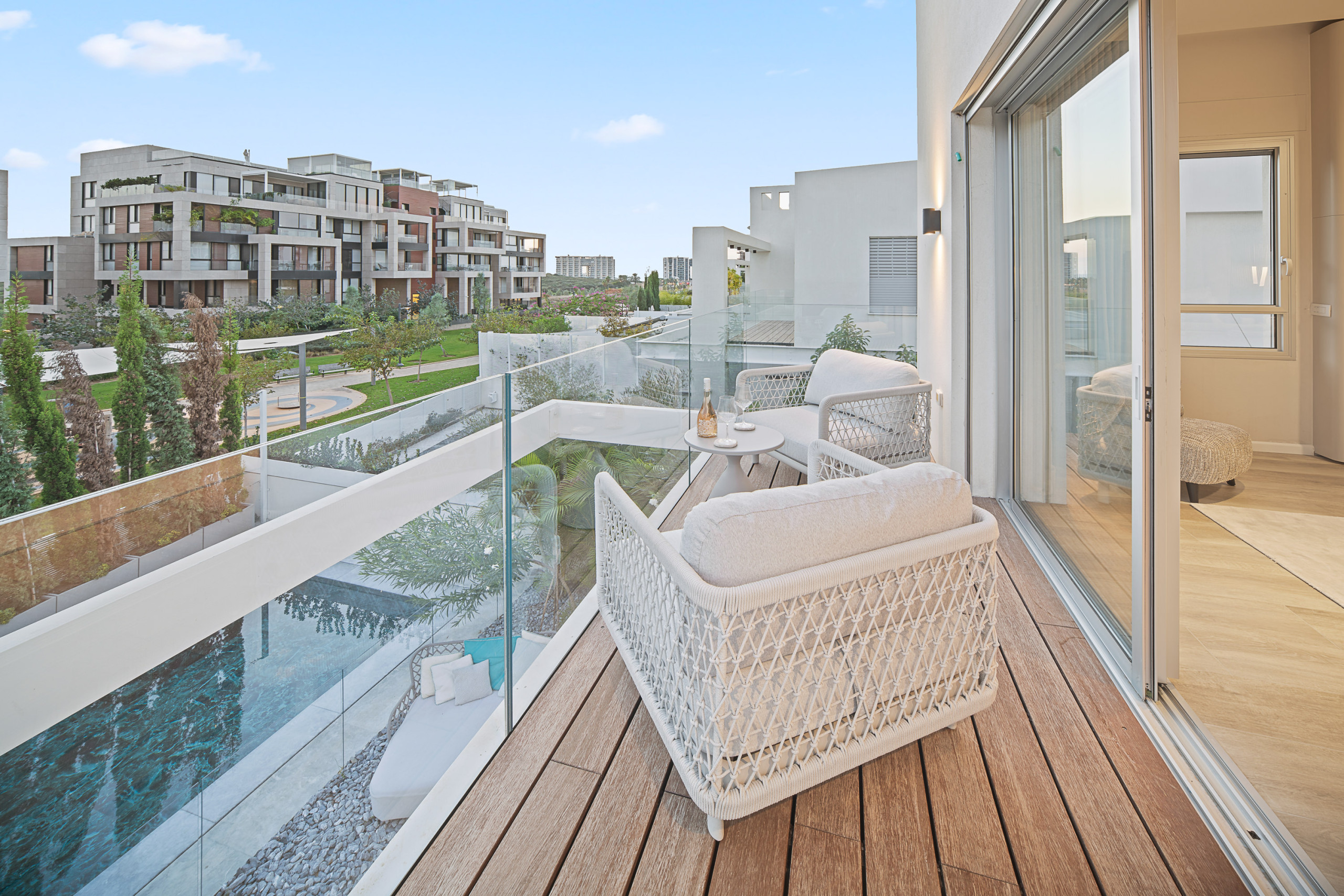 Главная спальня (спальня 1) с кошерной кроватью (может быть сделана как кровать king size или две отдельные кровати 90 см), Smart TV, встроенный шкаф в полный рост и собственная полная ванная комната с душем walk-in. Доступ к частной меблированной террасе площадью 12 м².