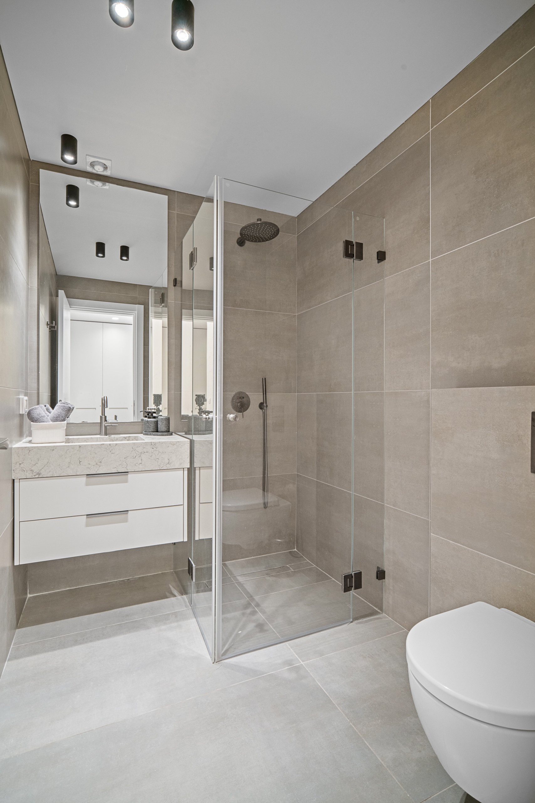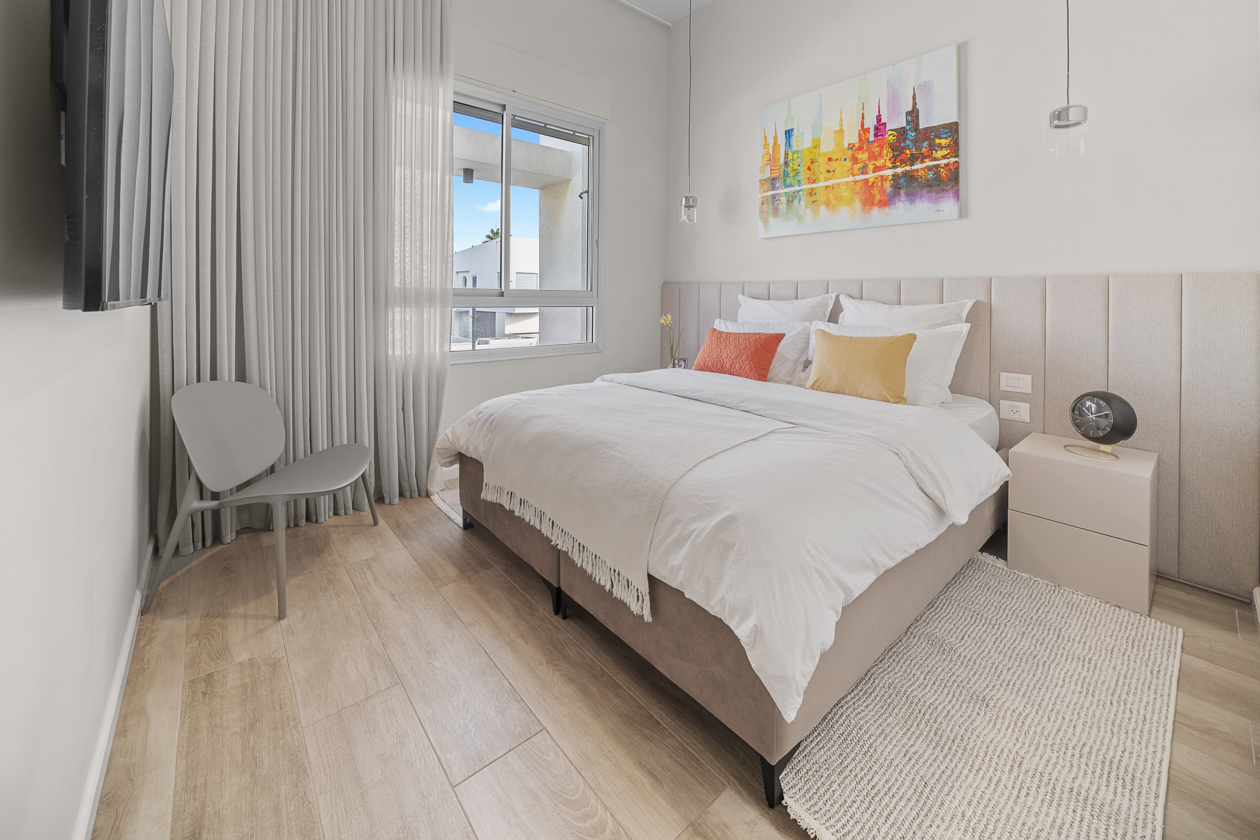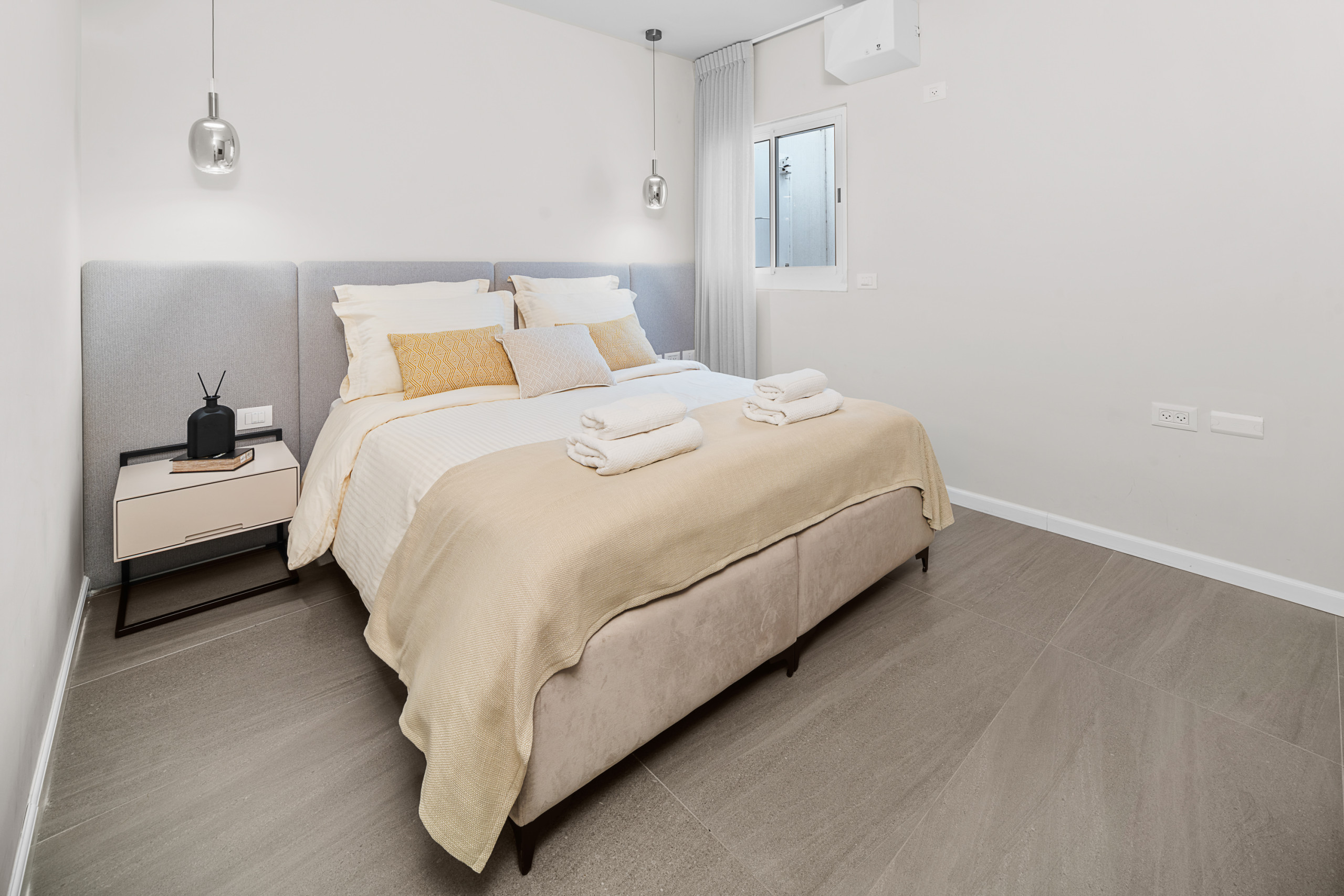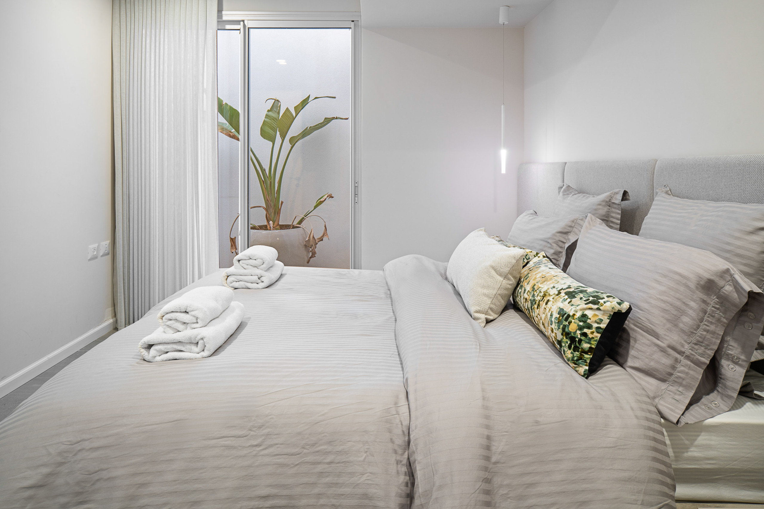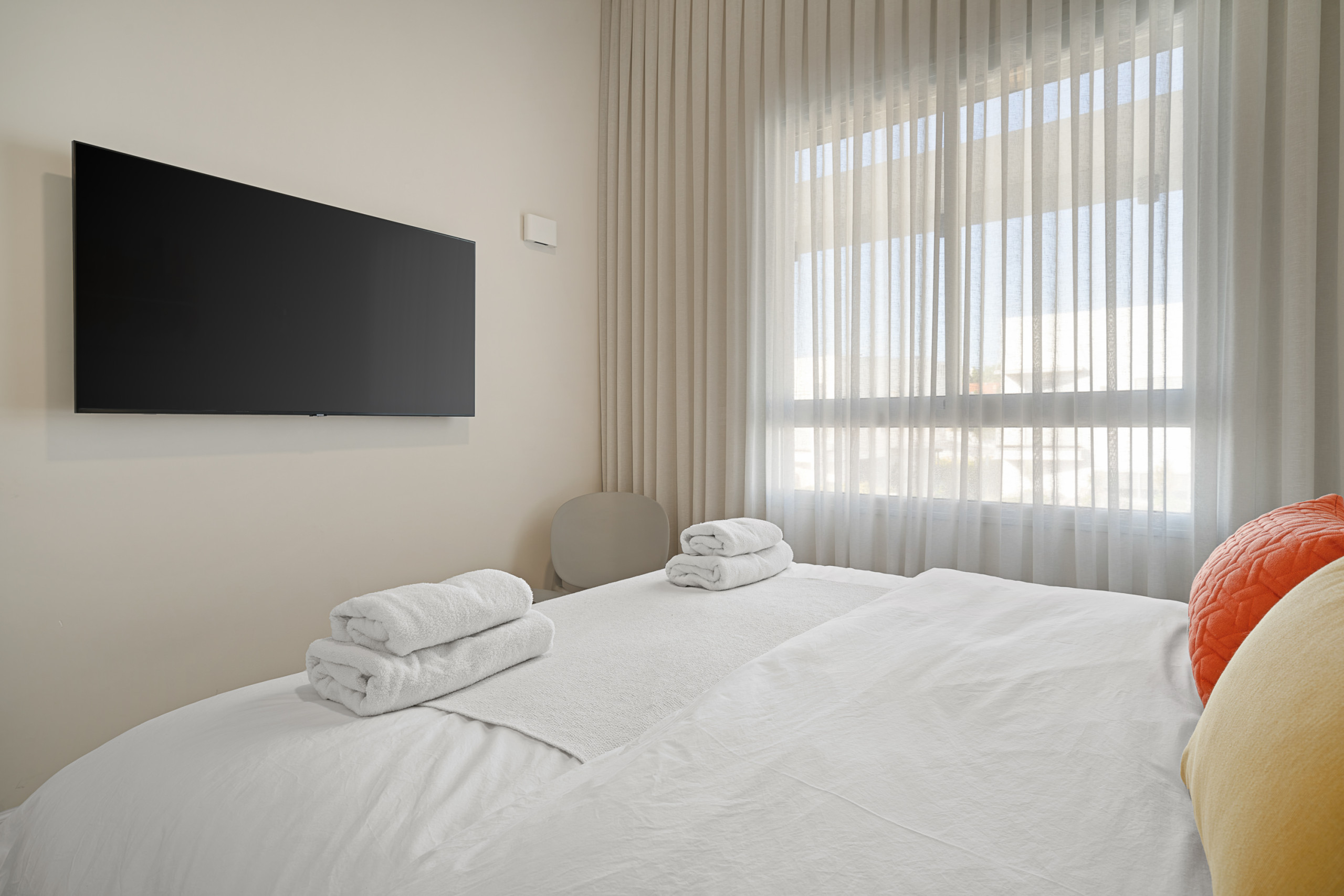 Каждая спальня оснащена кошерной кроватью (может быть сделана как двуспальная кровать или две одноместные кровати 80 см), Smart TV, встроенным шкафом в полный рост и собственной полной ванной комнатой с душем с входом.