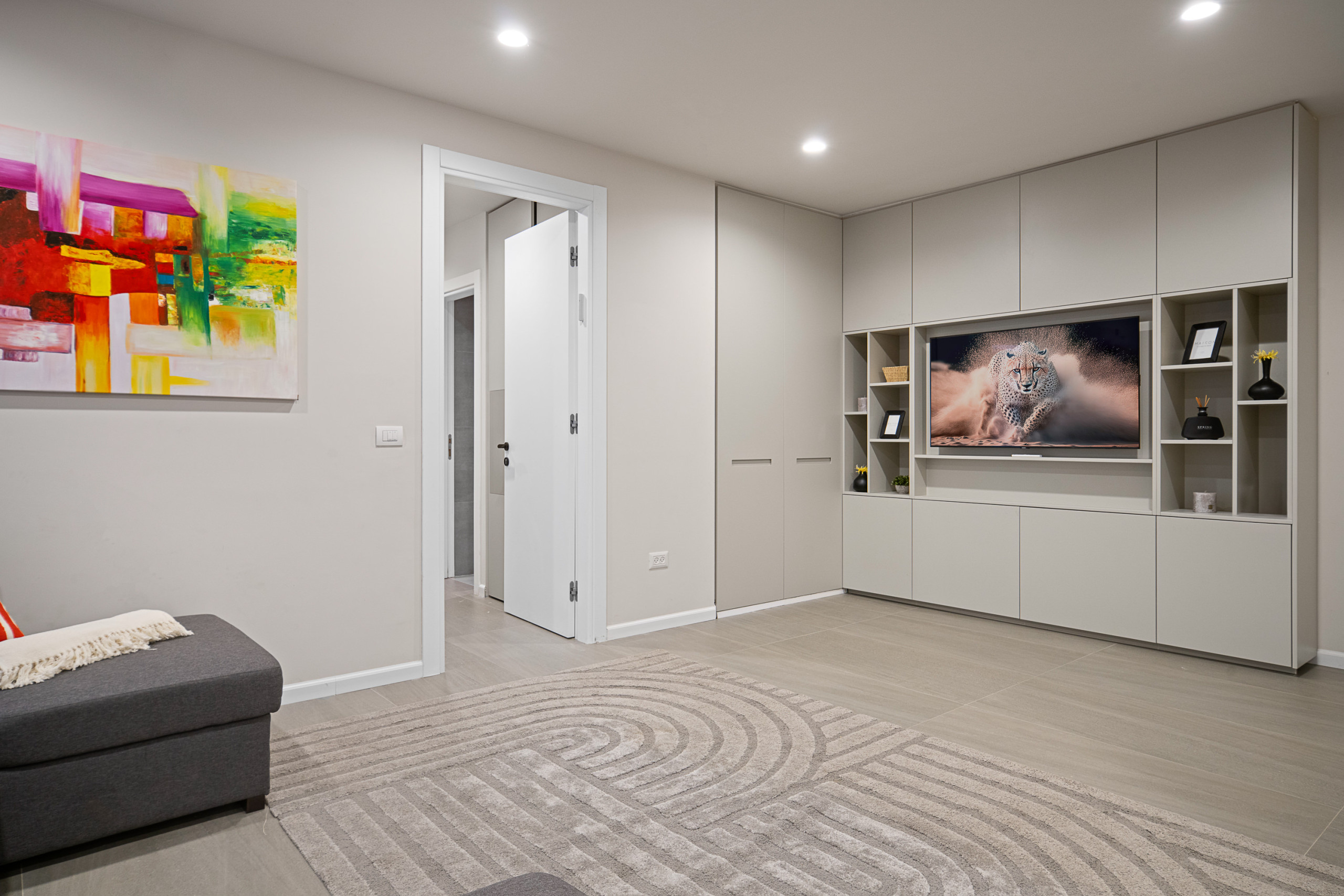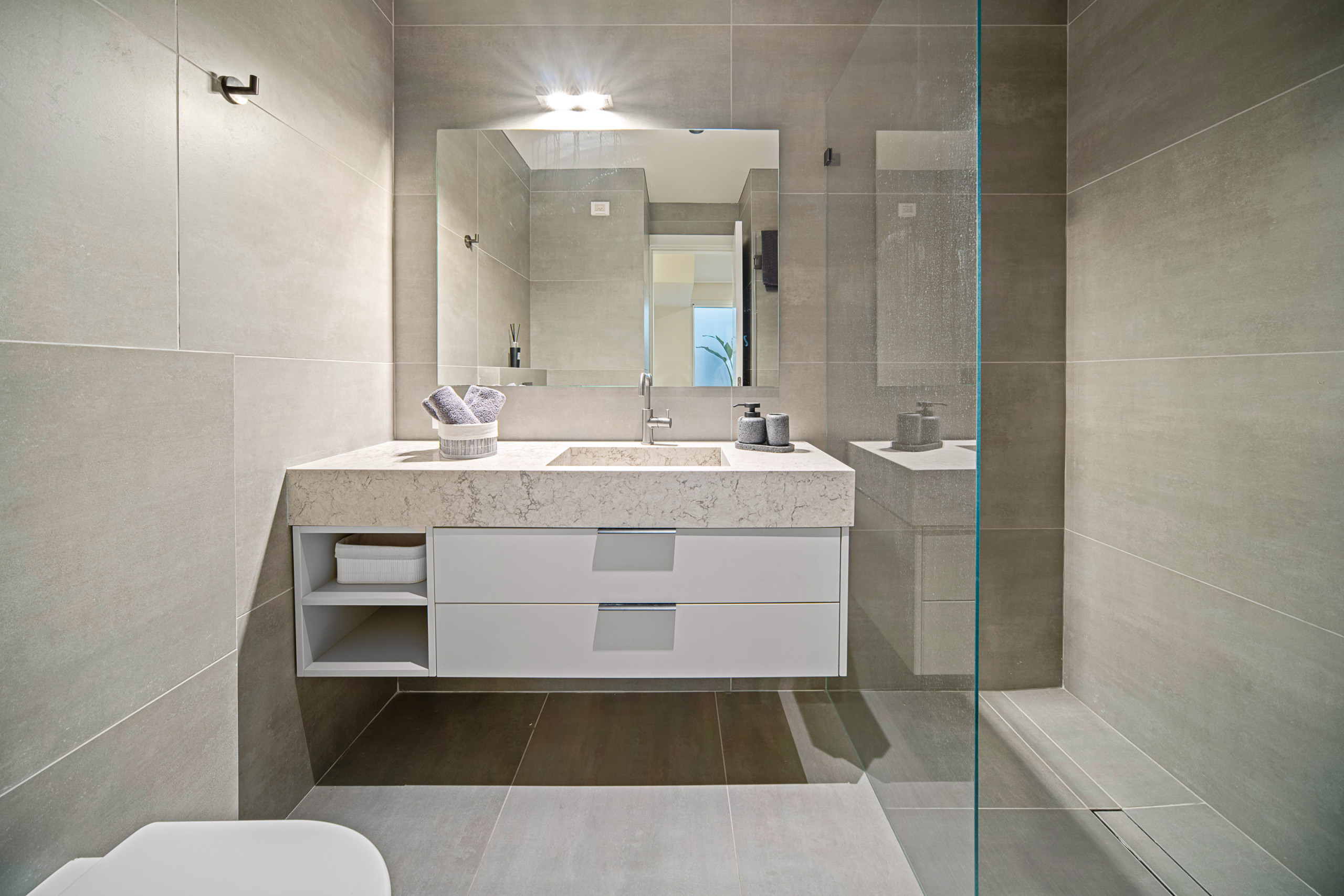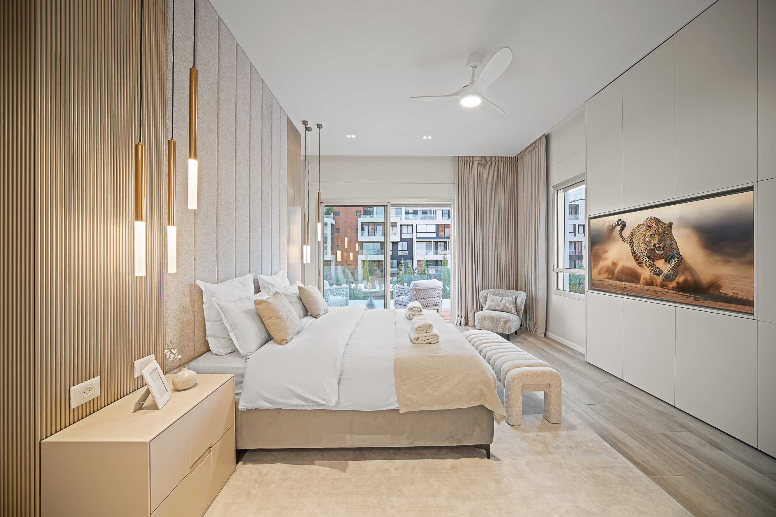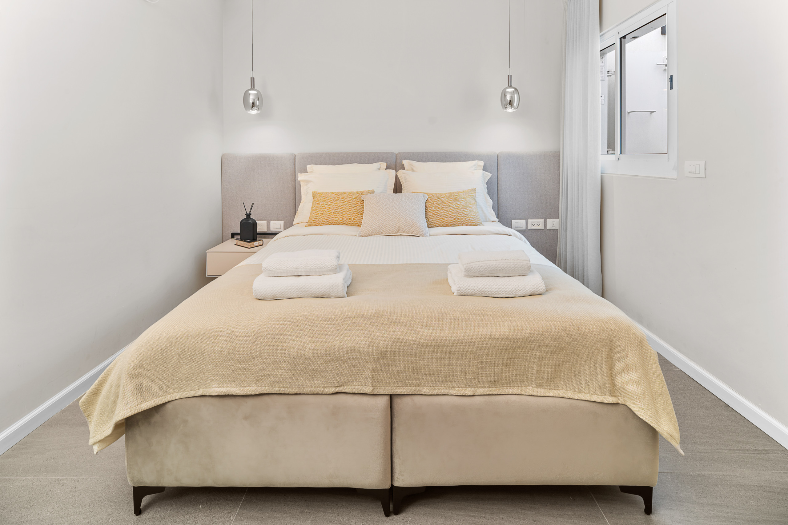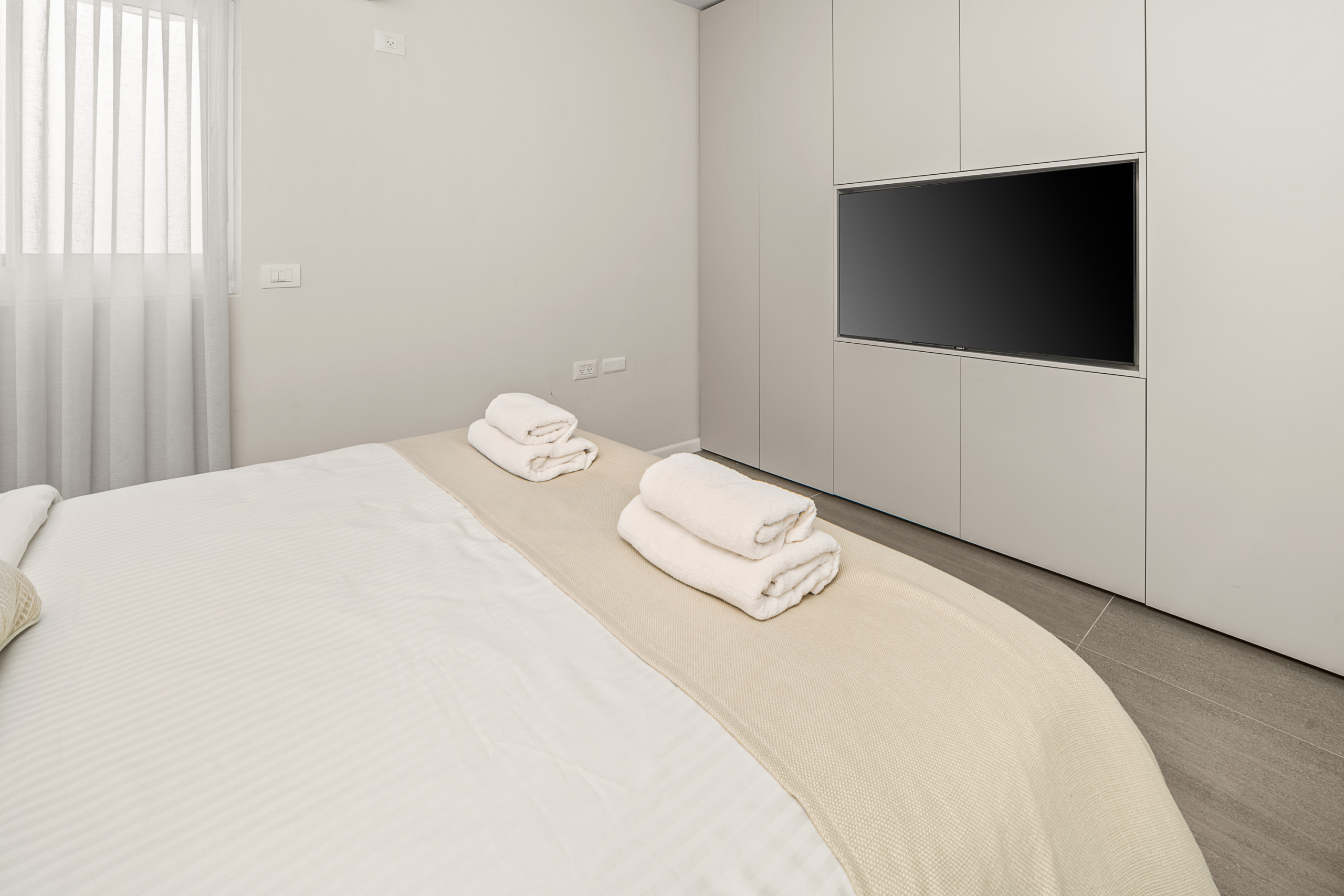 Каждая спальня оснащена кошерной кроватью (может быть сделана как двуспальная кровать или две отдельные кровати 80 см), Smart TV, встроенным шкафом в полный рост и собственной полной ванной комнатой с душем walk-in.