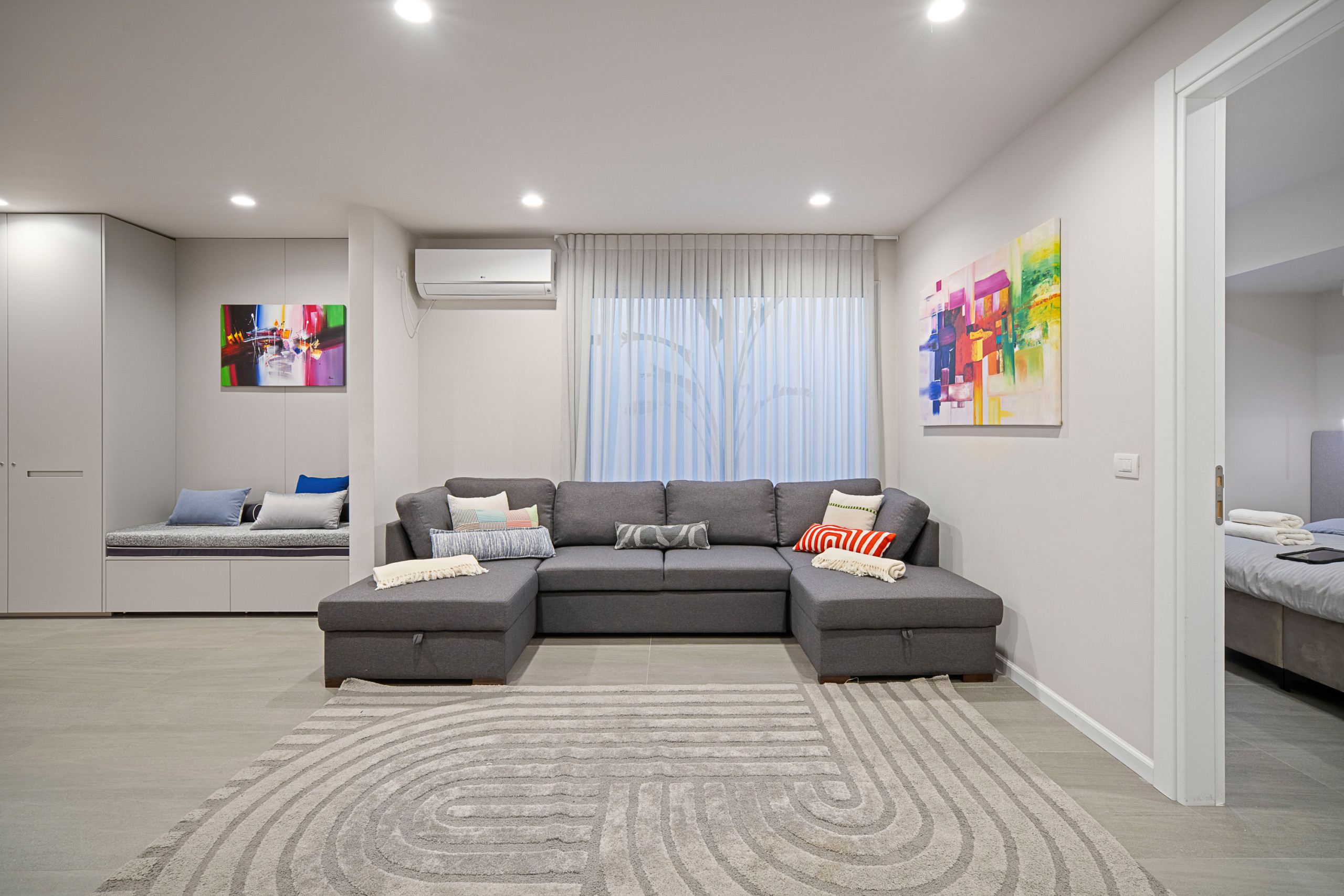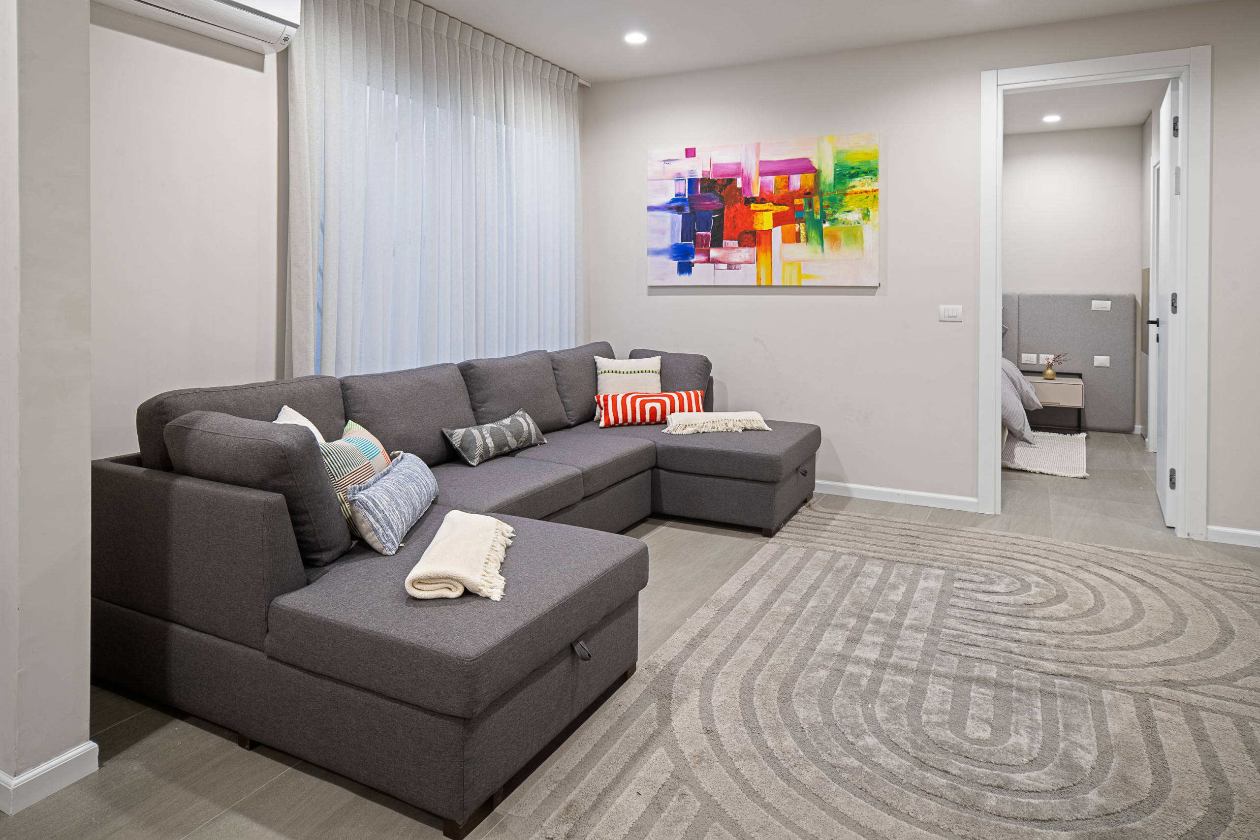 Вторая гостиная, обставленная диваном XL и оснащенная Smart TV. Диван может спать еще 3 человека, так как раскладывается как двуспальная кровать и одноместная кровать вместе.