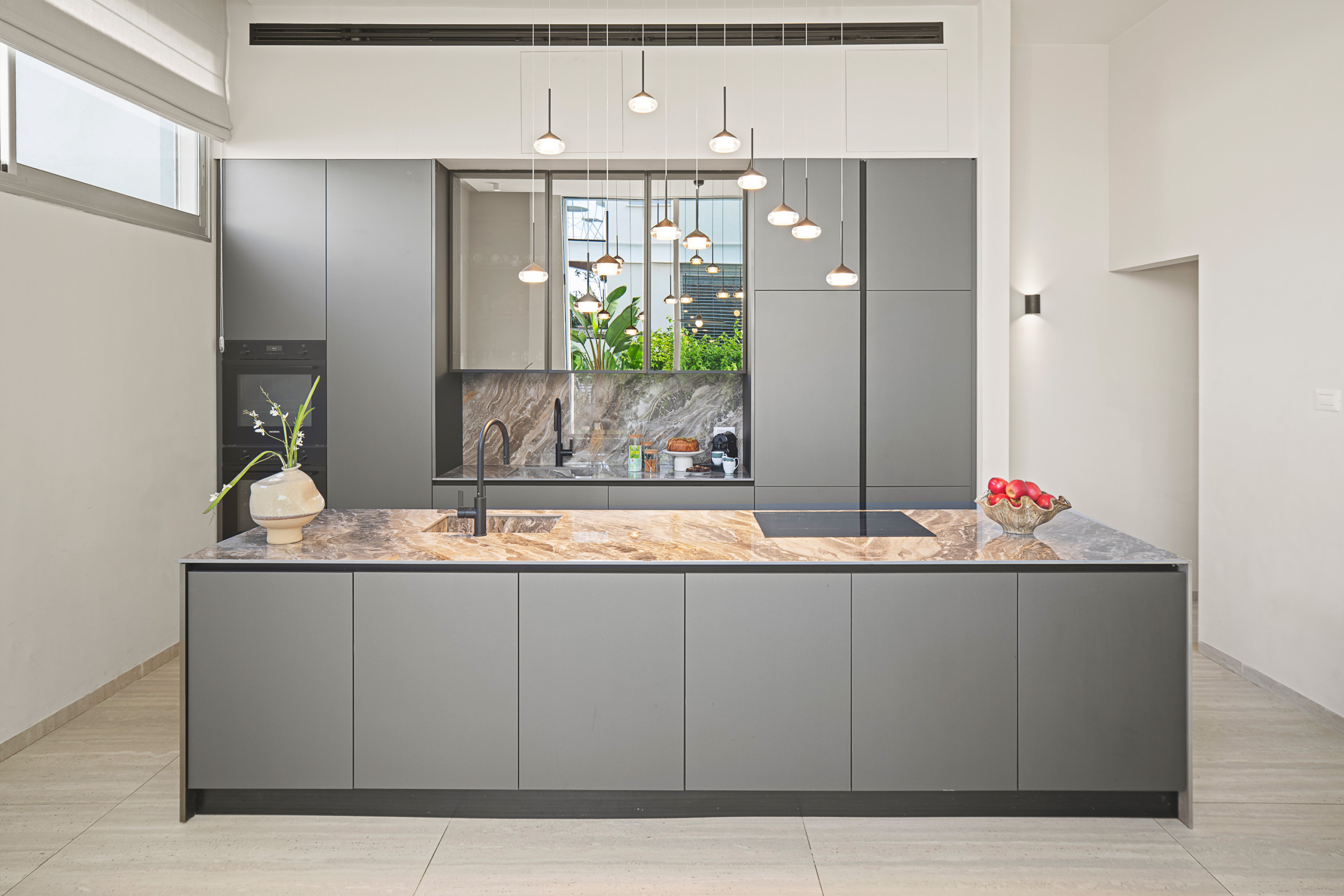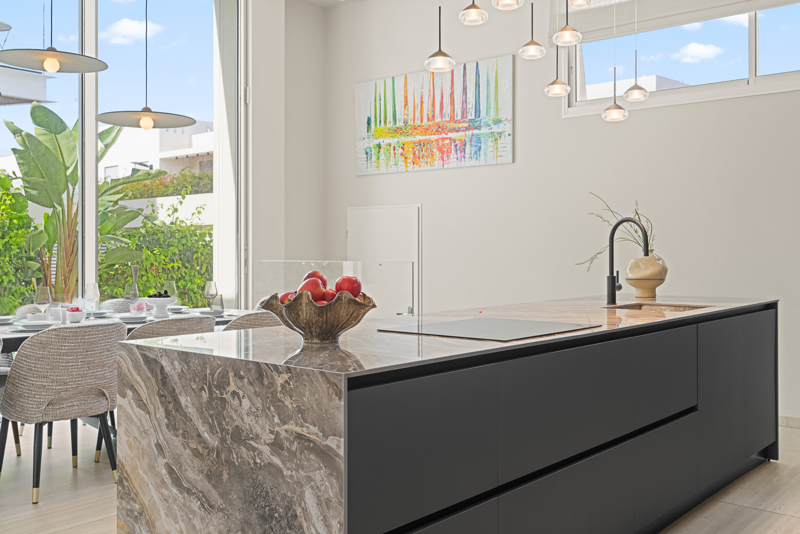 Полностью оборудованная открытая кухня. Она имеет двойную раковину, двойную духовку и большой кухонный остров, который также является кухонной станцией.