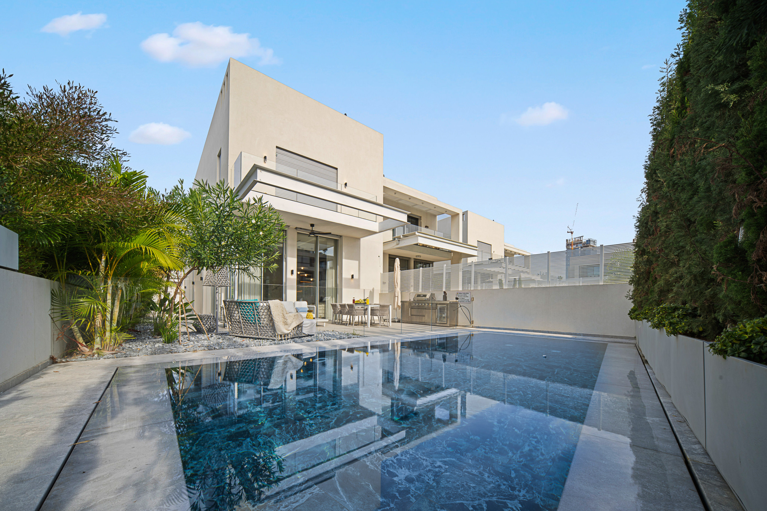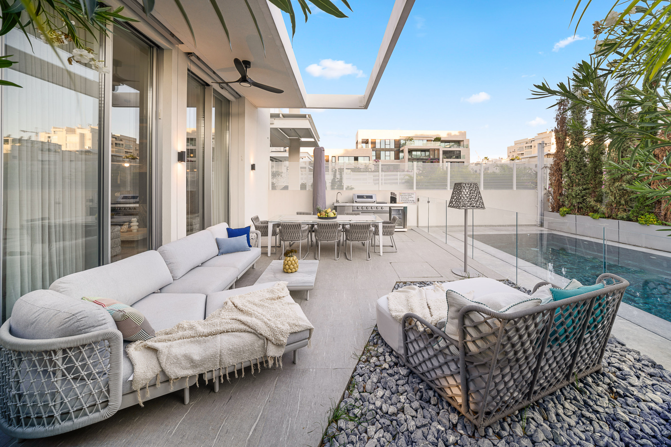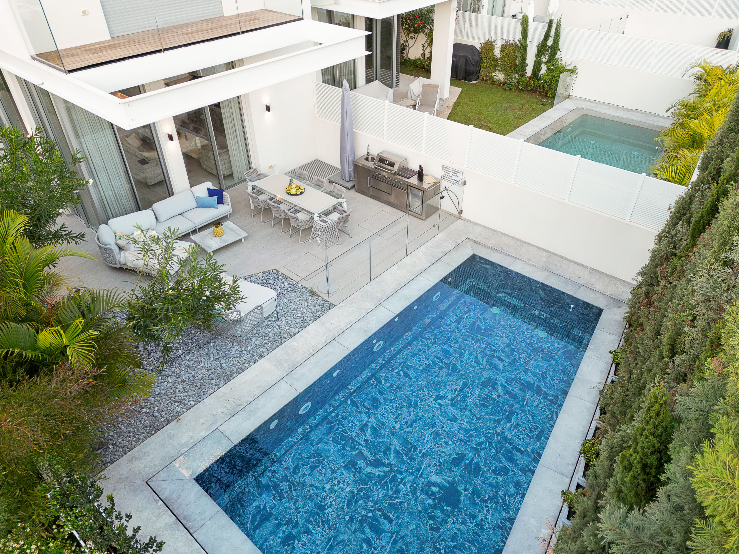 Доступ к патио из гостиной или обеденной зоны. Патио имеет зону отдыха и обеденную зону на 8 человек. Также здесь есть газовый гриль для вечерних барбекю и наружная кухня с раковиной. Бассейн размером 6X10 метров и имеет элегантный стеклянный барьер для безопасности.