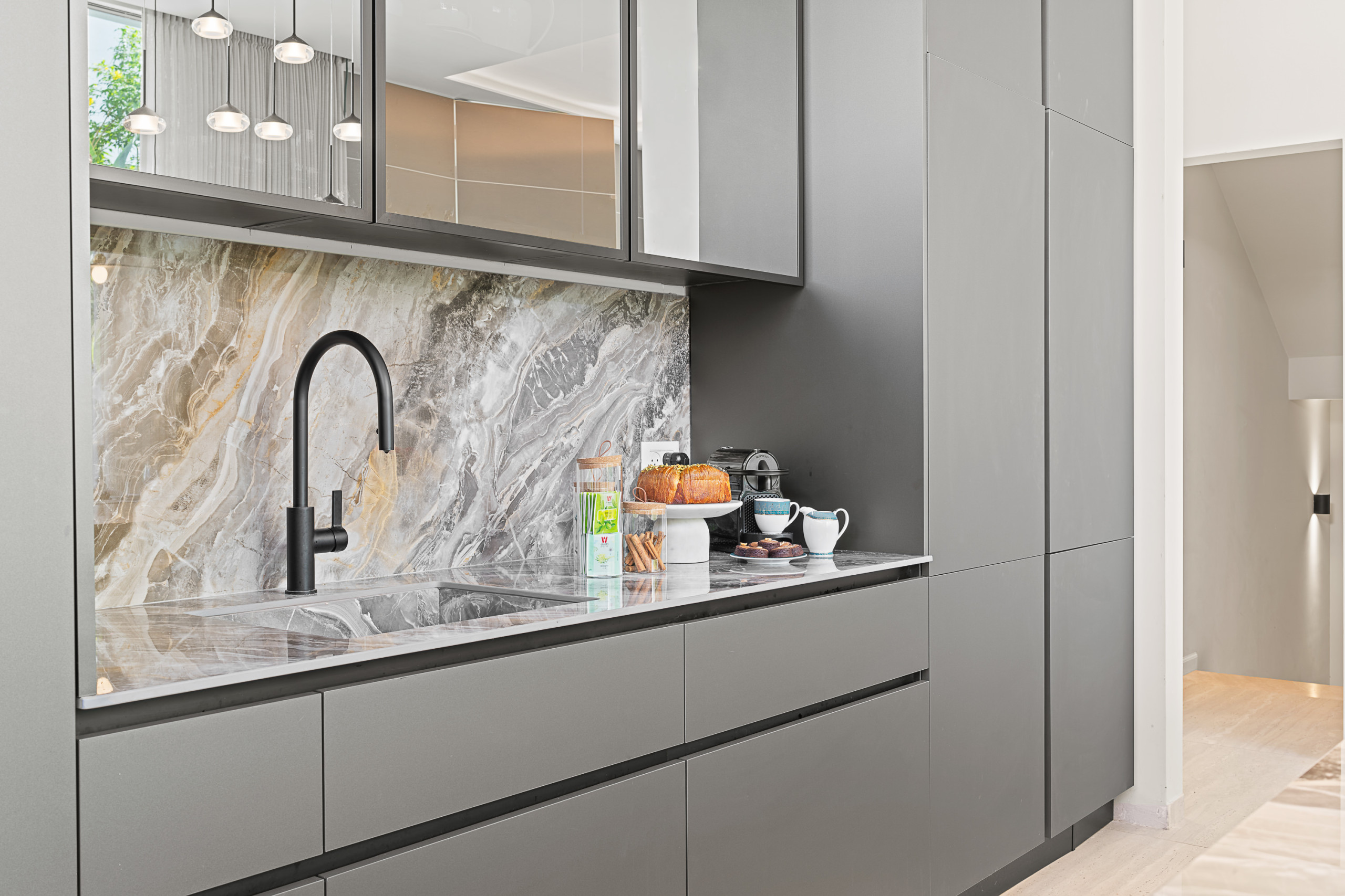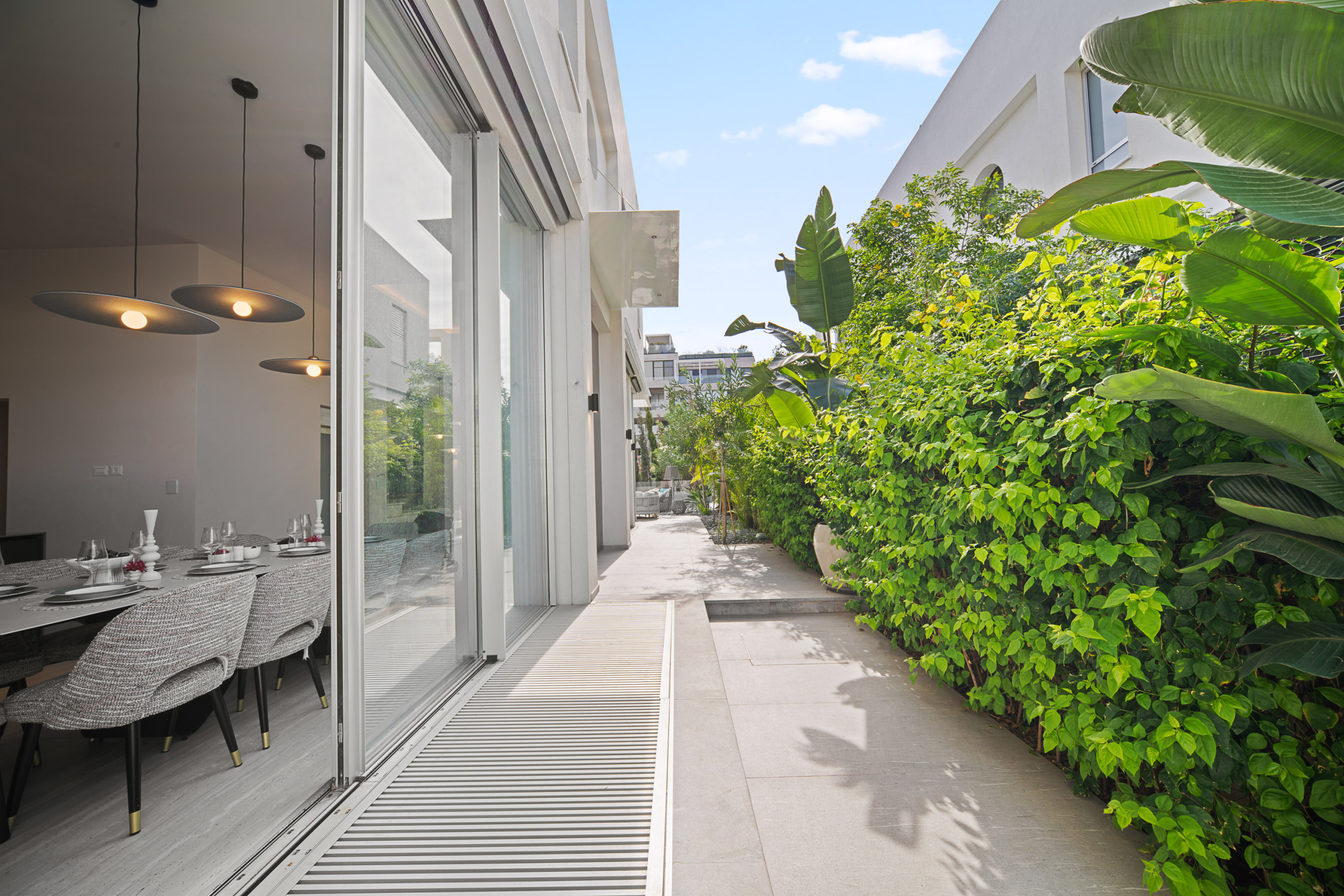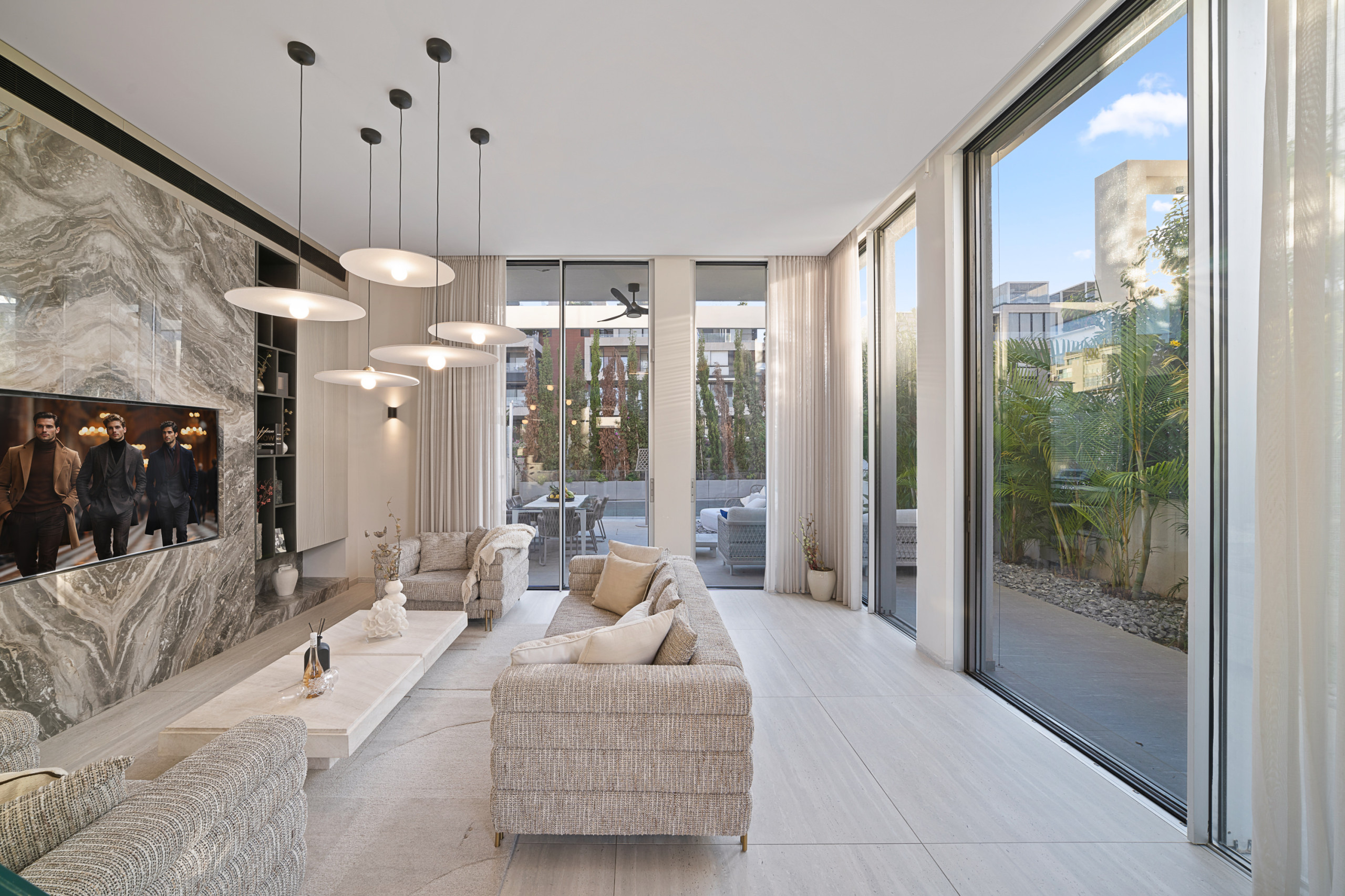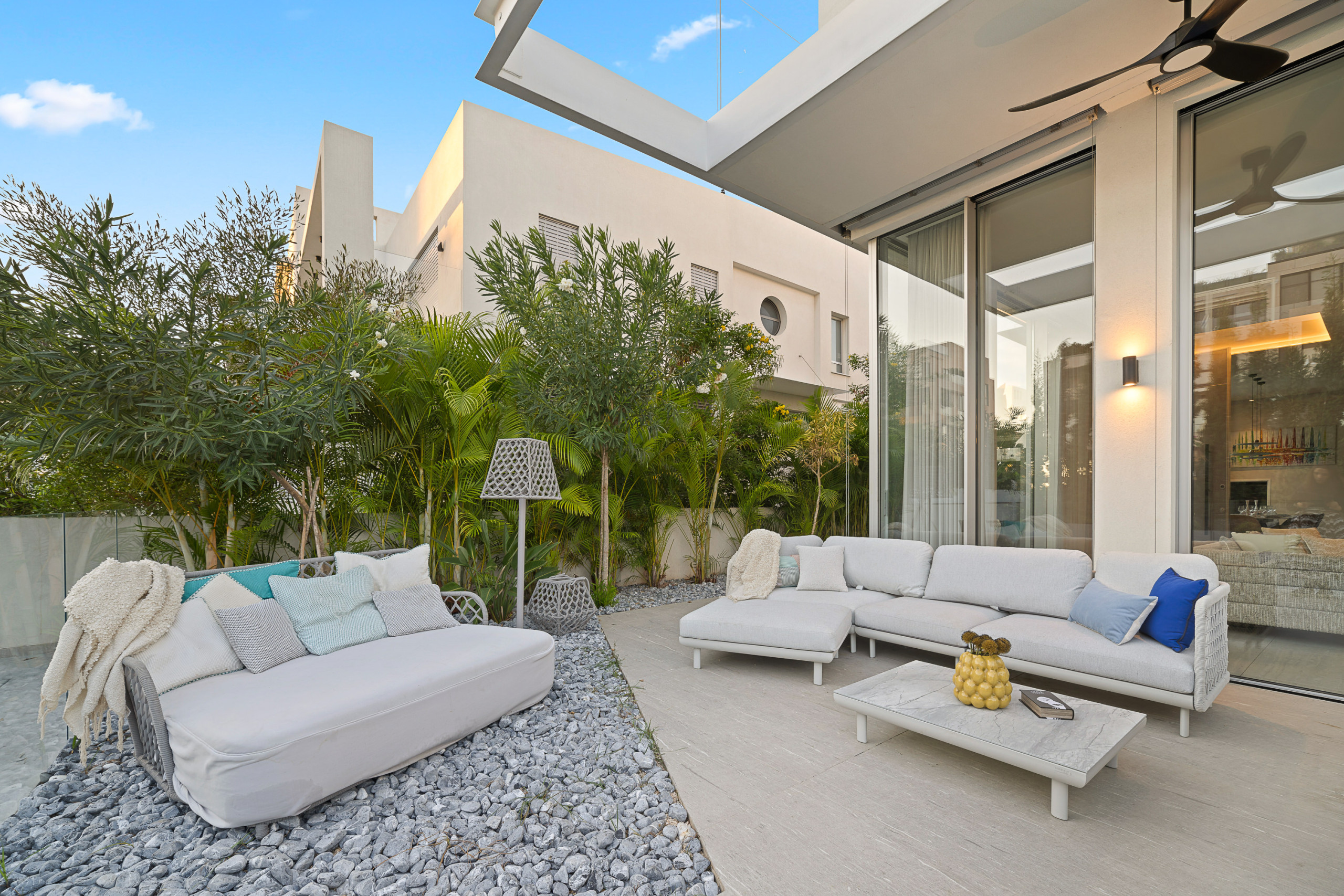 Доступ к патио из гостиной или обеденной зоны. Патио имеет зону отдыха и обеденную зону на 8 человек. Также здесь есть газовый гриль для вечерних барбекю и наружная кухня с раковиной. Бассейн размером 6X10 метров и имеет элегантный стеклянный барьер для безопасности.