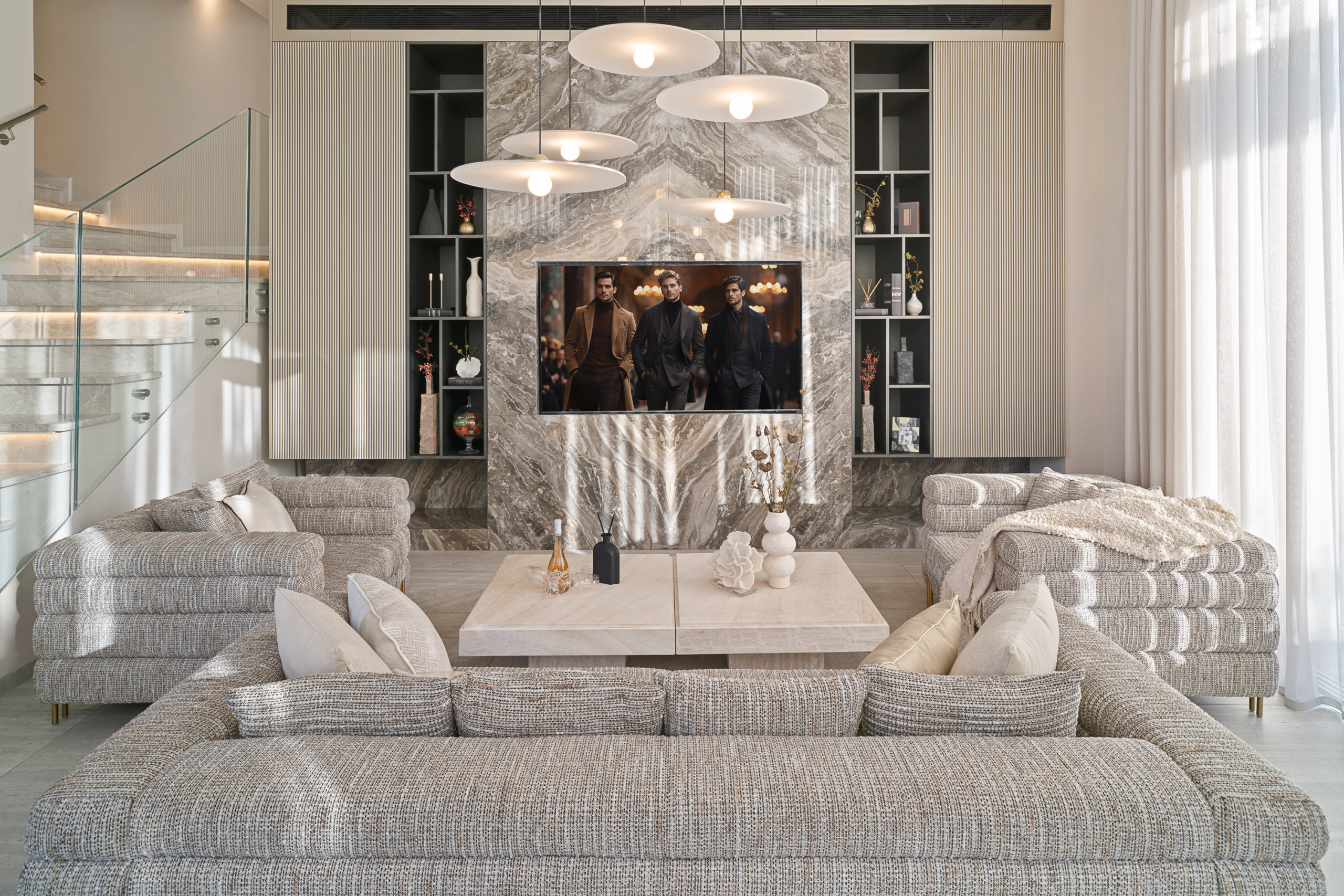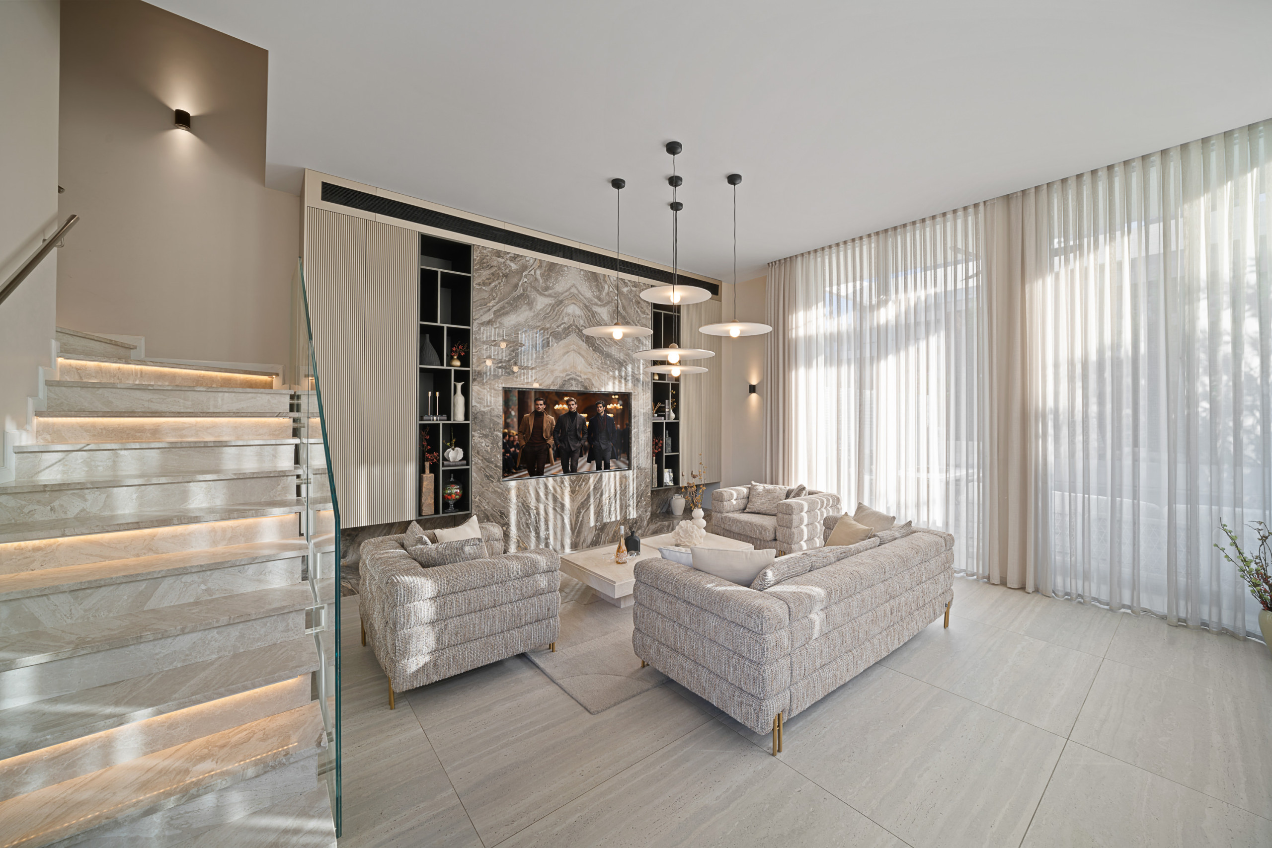 Роскошная гостиная с большим и удобным диваном и двумя креслами, оснащенная плоским телевизором.