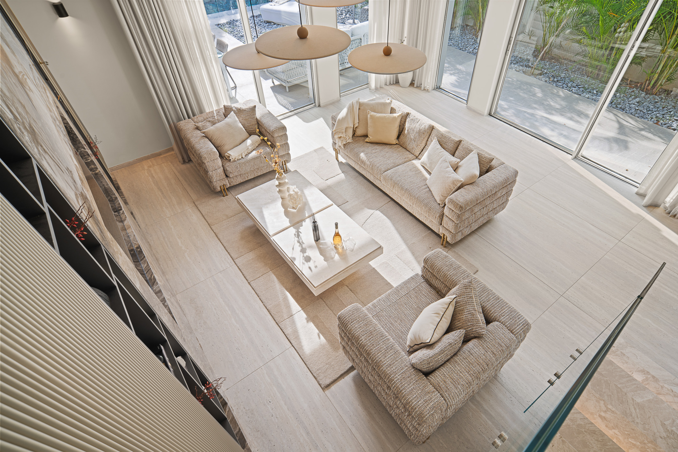 Вилла расположена на 3 уровнях. На первом уровне находятся жилые помещения, а также великолепная терраса с зоной отдыха, обеденной зоной на открытом воздухе и бассейном. Спальни расположены на верхнем и нижнем уровнях.